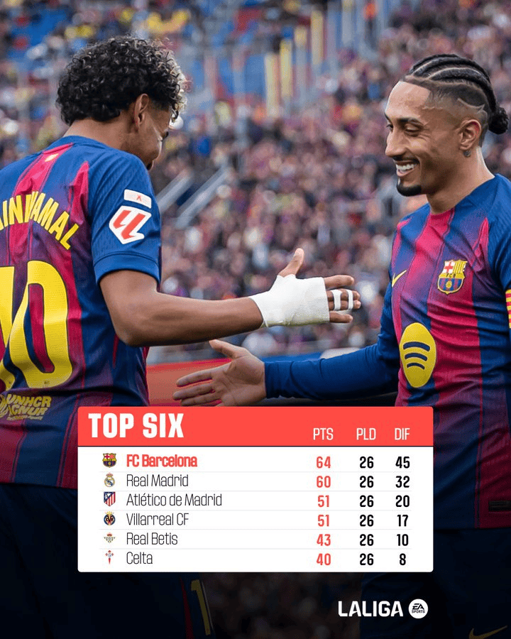 皇马遭遇两连败,巴萨稳居西甲榜首。